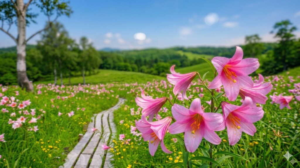- 「天空のひめさゆり」の絶景:展望ポイントからは、高原の爽やかな風に揺れるピンクの花々と、遠くに連なる奥会津の山々を同時に見渡すことができます。